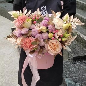 Ароматная шляпная коробка с хризантемой,колосками и лавандой “Ромашки в руках”