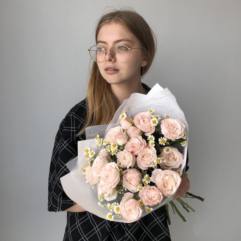 Нежный букет из пионовидных кустовых роз и воздушных веточек полевых ромашек упакован в стильную фирменную упаковку. Отличный подарок для любого повода.